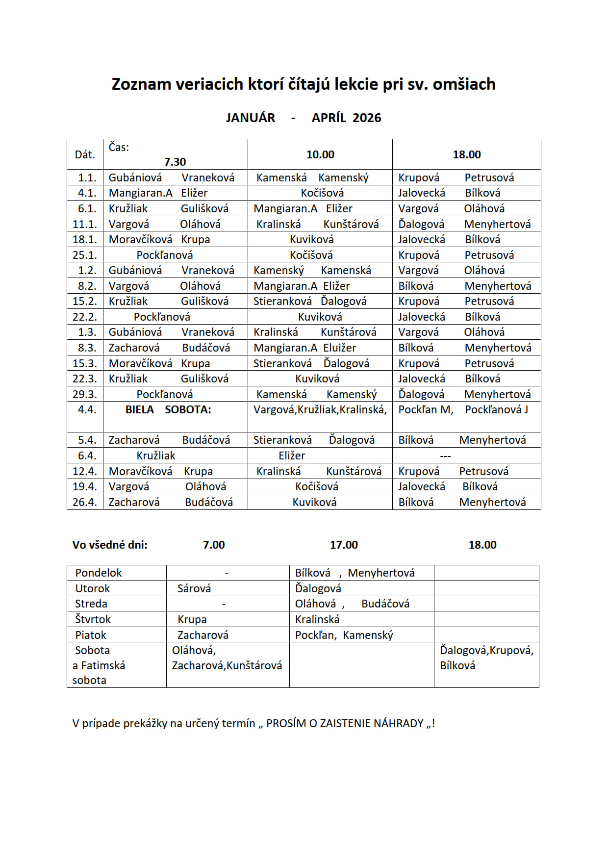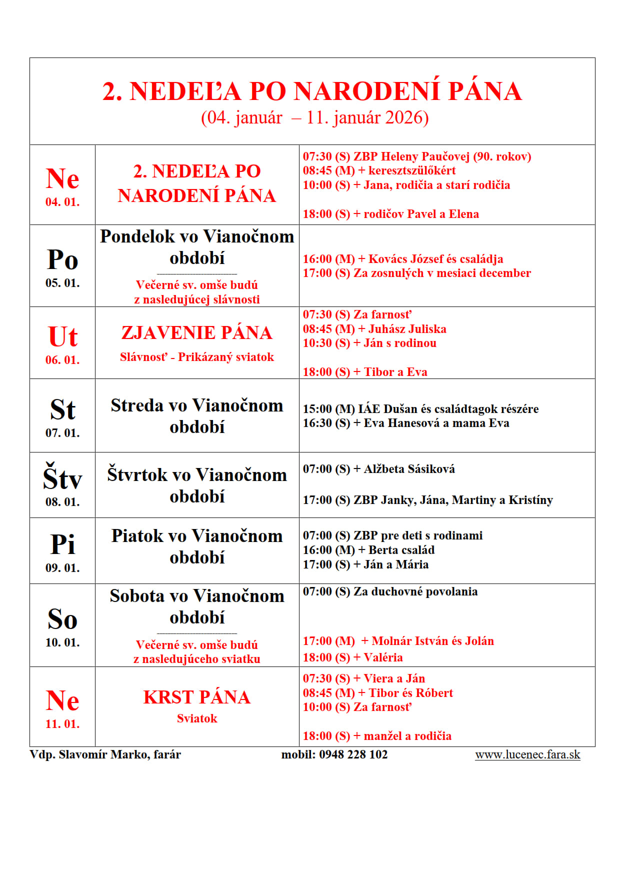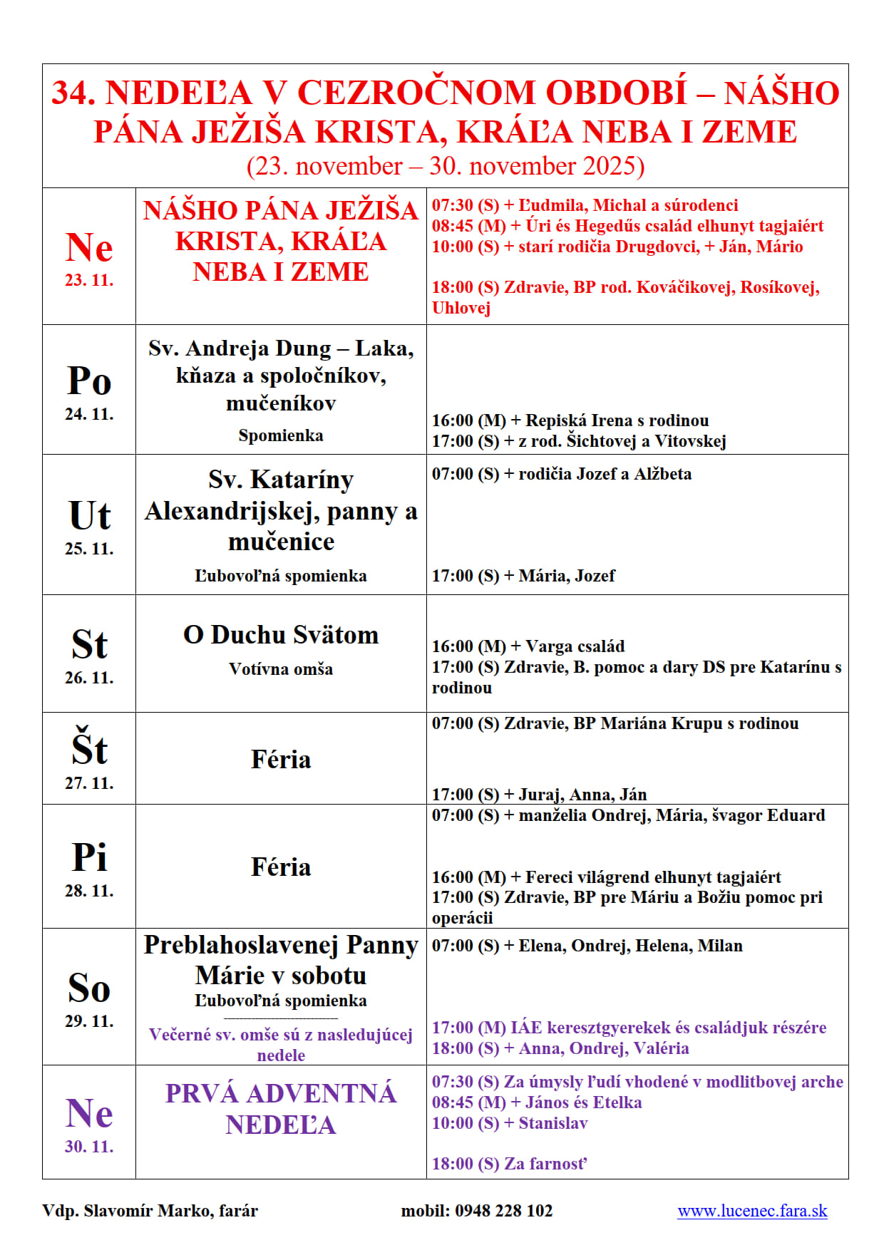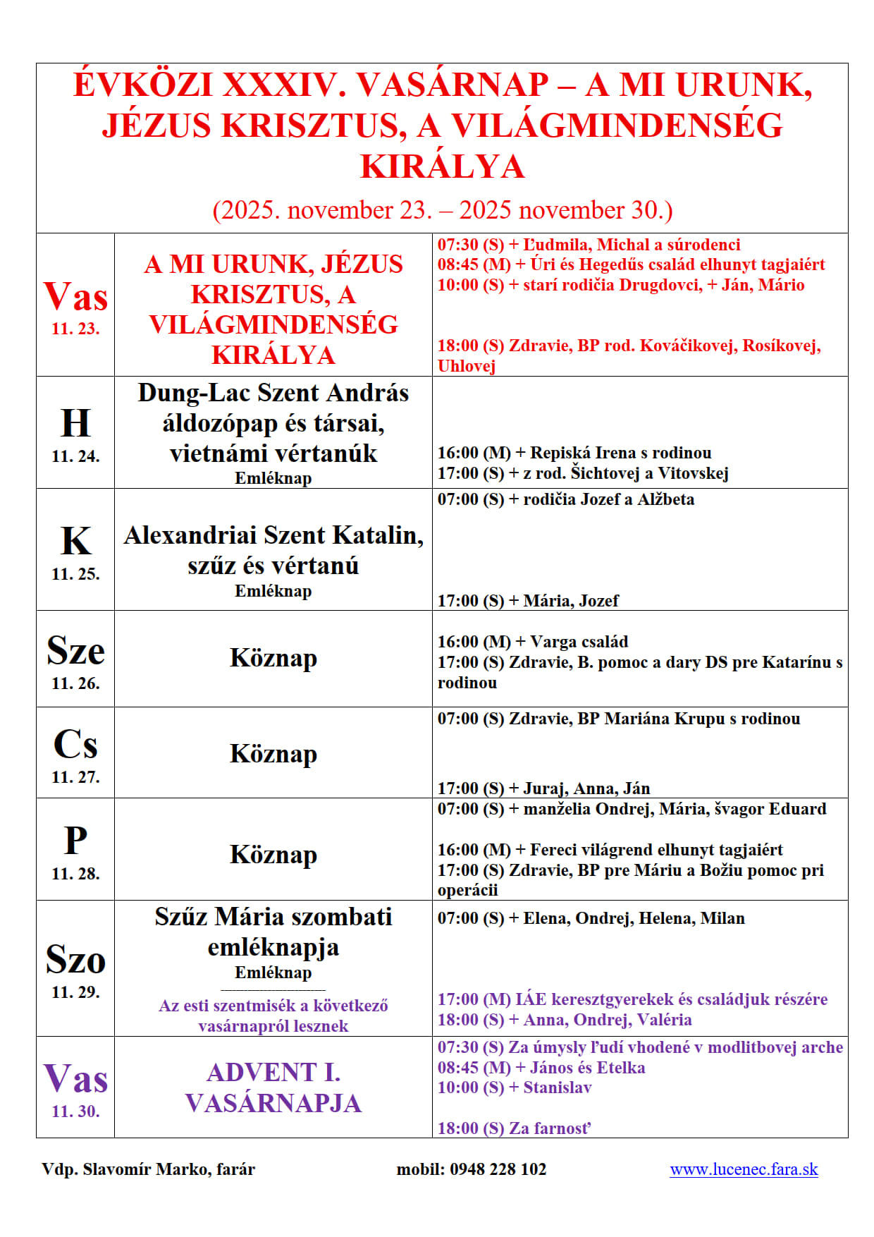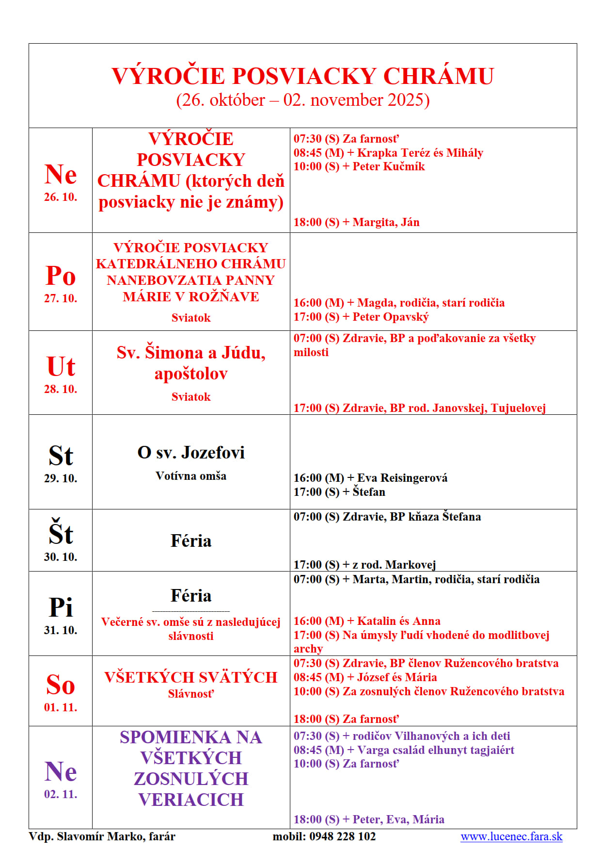 sa v rámci homílie prihovoria na tému nádeje. Rozpis tém homílií nájdete na priloženom plagáte. Spovedať sa bude v piatok v čase od 09:00 hod. do 11:00 hod. a hodinu pred večernou sv. omšou.Slavomír Marko, farár