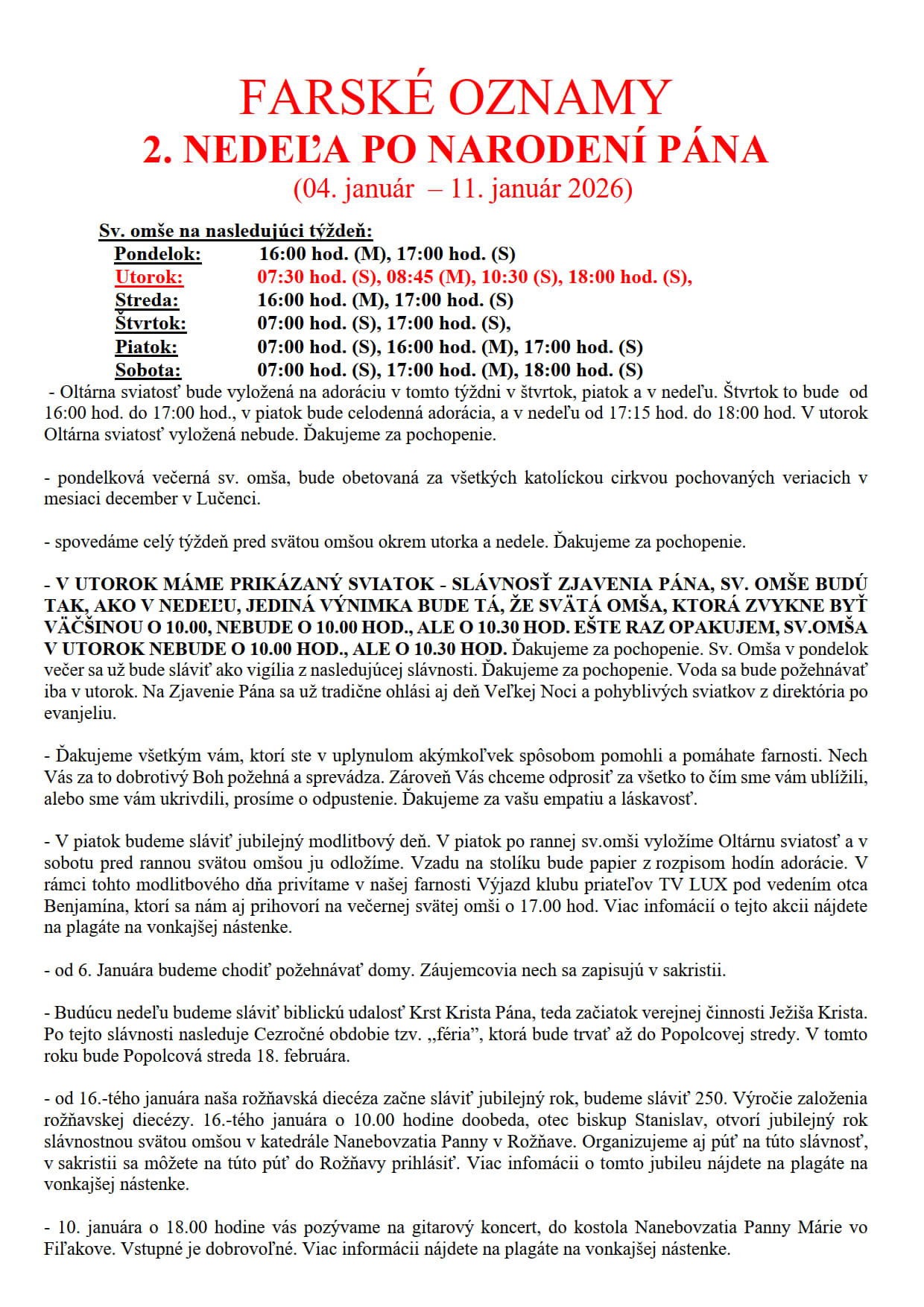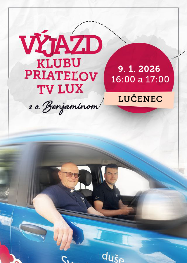 Pozývam kňazov a veriacich z okolia (zvlášť veriacich, ktorí sú v Klube priateľov TV LUX) na sv. omšu, ktorú bude v kostole Navštívenia Panny Márie v Lučenci meste 9. januára 2026 o 17:00 hod. celebrovať o. Benjamín Kosnáč, riaditeľ Klubu priateľov TV LUX. Sv. omšou zaroveň poďakujeme za Jubilejný rok nádeje 2025 a za Jubilejný chrám v Lučenci meste..