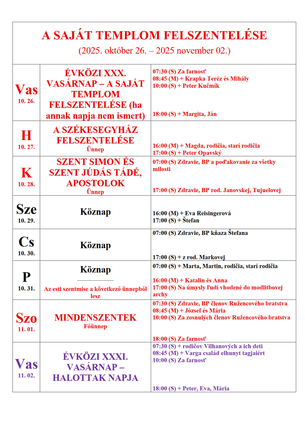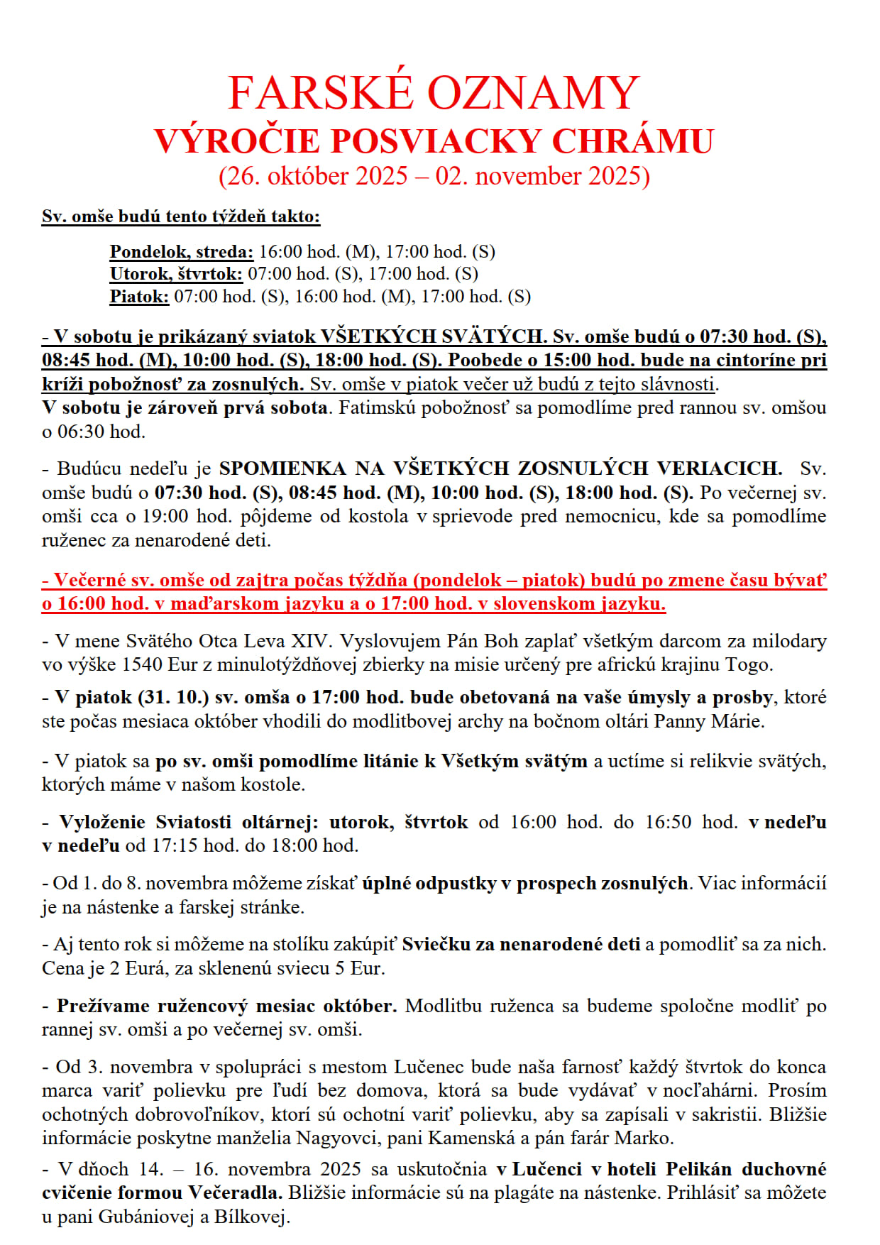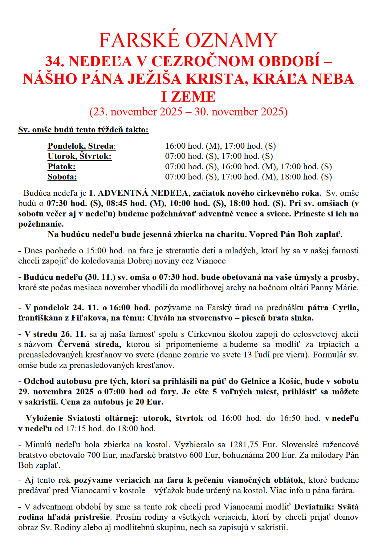 Otec biskup pozýva kňazov a veriacich našej Rožňavskej diecézy na slávenie Rožňavskej novény, ktorá bude v dňoch 16. - 24. októbra 2025 v Katedrále Nanebovzatia Panny Márie v Rožňave. Náš dekanát Dolný Novohrad bude mať púť v sobotu 18. 10. 2025. Pozývam veriacich aj našej farnosti. Záujemcovia nech sa zapíšu v sakristii, cena za autobus bude 10 Eur. Predpokladaný odchod autobusu je o 15:30 hod. od fary.